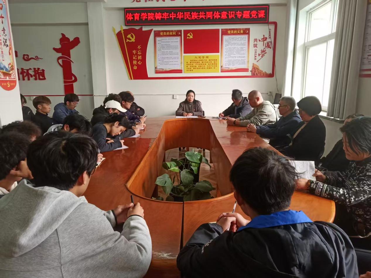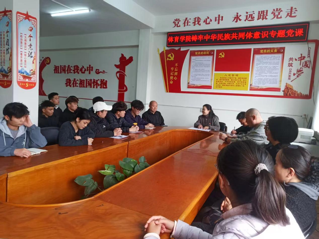 2025年10月24日,体育学院在学院三楼会议室召开铸牢中华民族共同体意识暨民族宗教政策法规专题党课。会议以“抓好课堂教育阵地,将习近平总书记关于民族宗教工作的重要论述融入课程思政”为核心主题,通过深入研讨,有效达成了统一思想、明确方向、凝聚共识的预期目的。