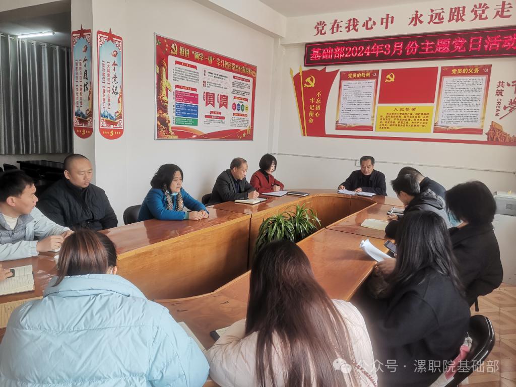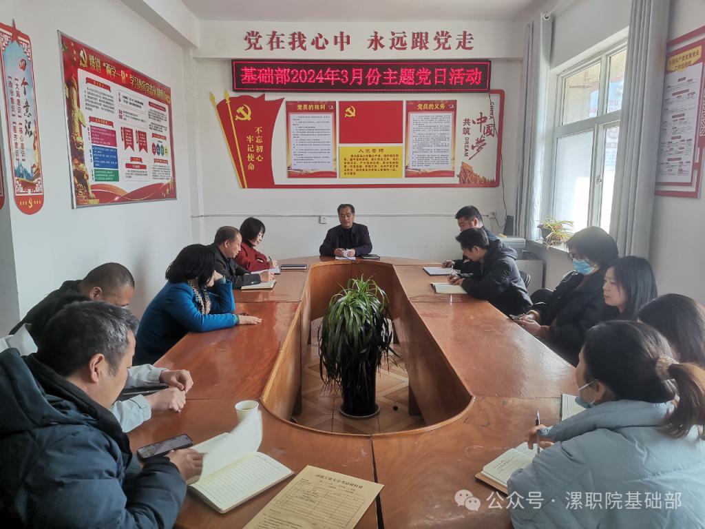 3月12日,漯河职业技术学院基础部党支部组织召开2024年3月份主题党日活动,进行专题学习。基础部党支部书记朱献周主持会议,全体党员参加会议。