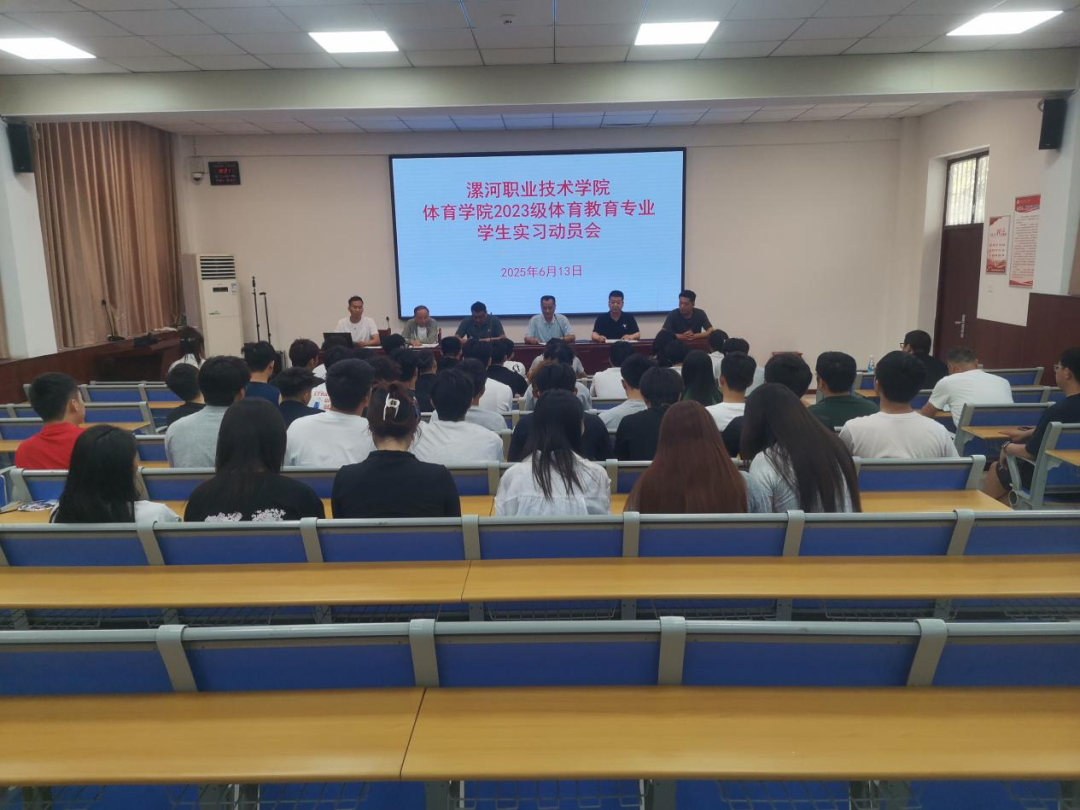6月13日下午,漯河职业技术学院体育学院召开2023级体育教育专业学生实习动员会。体育学院党总支书记安国彦,教学负责人毕荣华、学管负责人李纪以及体育教育专业指导教师、辅导员和全体学生参加会议。会议由体育学院院长朱献周主持。