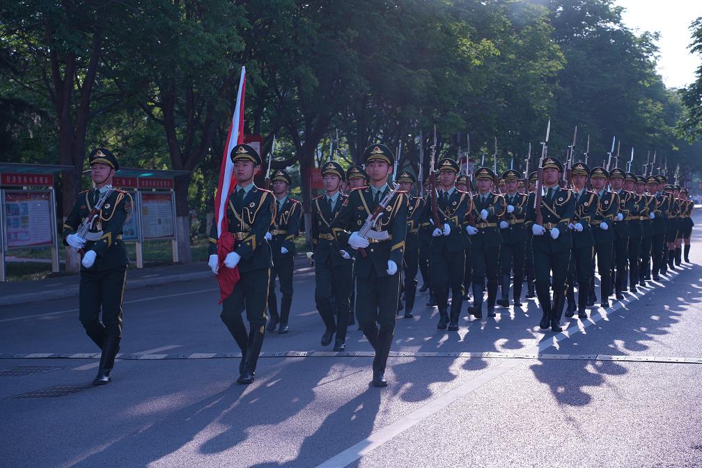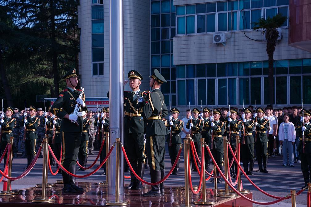 晨光熹微间,旭日东升,金色的光芒洒满校园,为宁静的楼宇与葱郁草木镀上一层温暖光晕。“升国旗仪式现在开始,请漯河职业技术学院国旗护卫队出旗……”。随着主持人口令的发出,国旗护卫队队员们迈着整齐有力的步伐、呼喊着嘹亮的口号出旗,他们坚定的目光、划一的动作,彰显着青春萌动的蓬勃力量与对国旗的敬重。在激昂高亢的国歌声中,五星红旗徐徐升起,高高飘扬。全体师生行注目礼,心中充满对伟大祖国的热爱与敬意。