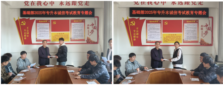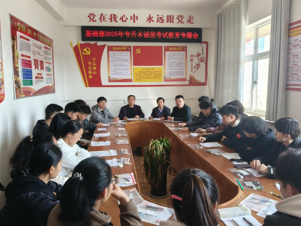为营造一个公平公正、风清气正的考试氛围,3月16日,漯河职业技术学院基础部组织召开2022级体育教育专业学生2025年专升本诚信考试教育专题会,开展诚信考试教育,传达学习专升本考试相关规定和注意事项。院学生处智水立老师到会指导。基础部主任朱献周、辅导员彭团辉参加会议。会议由基础部学管负责人、办公室主任李纪主持。