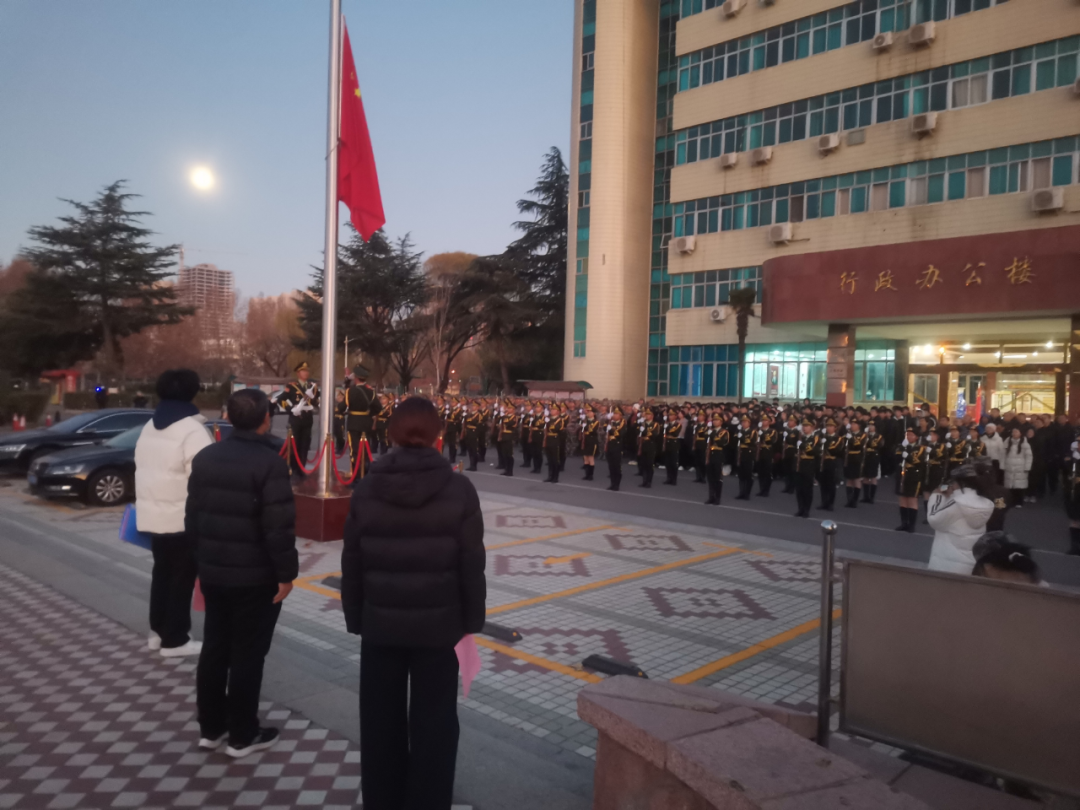 “升国旗仪式现在开始,全体肃立,由国旗护卫队出旗……”。寒冬日晓,晨曦初破霜露,庄重肃穆的氛围笼罩着美丽的校园。国旗护卫队迈着整齐有力的步伐出旗,他们坚定的目光、划一的动作,彰显着青春的蓬勃力量与对国旗的敬重。在激昂的国歌声中,五星红旗缓缓升起,迎风飘扬。全体师生行注目礼,心中满是对祖国的热爱与敬意。