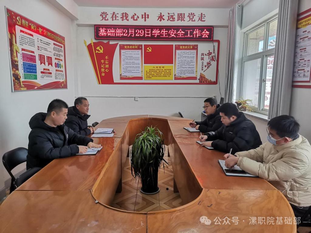 会议最后强调,安全大于天,责任重于山。要认真贯彻落实学校2024年春季学期学生工作专题会议精神,确保学生们安全、顺利地返校,推动新学期各项学生管理工作安全、有序、高效地开展。要以饱满的热情、积极的态度迎接新学期的各项工作,不断加强大学生思想政治教育和学生组织建设,在打造基础部特色和亮点上下大功夫,在学生日常管理上出新招、见实效、立新功,全心全意为学生生活和学习保驾护航、提供优质服务,切实把立德树人根本任务落到实处,为推动学院高质量发展贡献力量。
