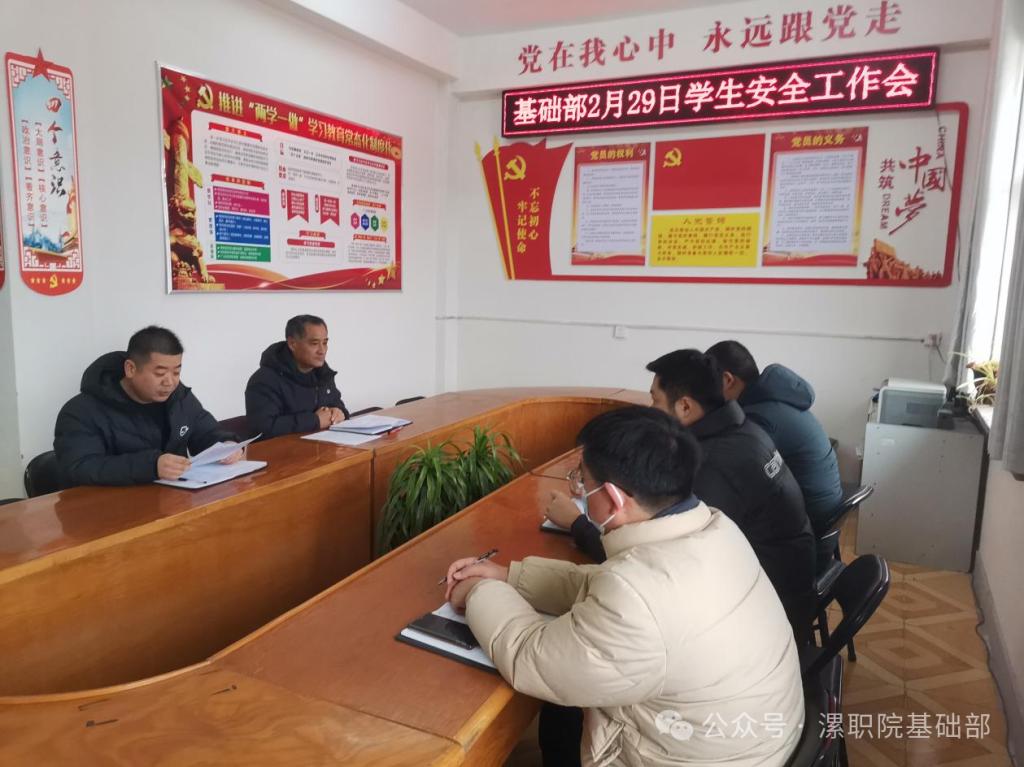 2月29日,漯河职业技术学院基础部召开2024年新学期春季学期学生安全工作会议。会议由基础部学管负责人兼办公室主任李纪主持,党支部书记兼主任朱献周和全体辅导员参加会议。会议传达学习了《关于做好2024年春季学期学生返校工作的通知》和学校2024年春季学期学生工作专题会议精神,并就新学期工作特别是开学前后重点工作进行具体安排和部署。